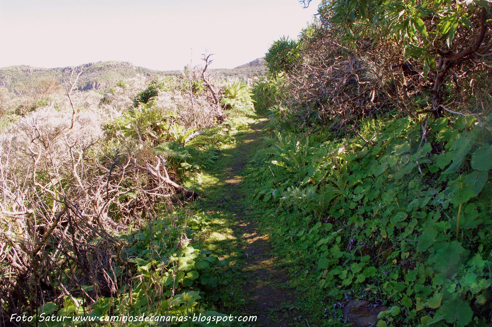 Pasamos bajo el roque y llegamos a un cruce de caminos, el de la izquierda va a los Órganos y el de la derecha sube al Camino de los Taginastes, pero es bastante complicado, seguimos de frente entrando y bajando hacia el Barranco de la Umbría o de la Capellanía.